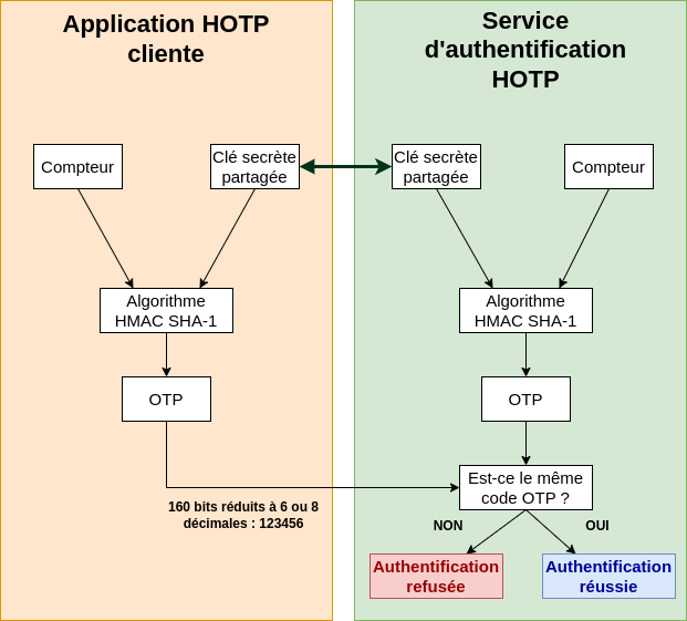 HOTP (pour HMAC One Time Password) est un mécanisme d’authentification reposant sur l’utilisation d’une clé secrète et d’un compteur commun entre le client et le serveur. HOTP ne nécessite donc pas l’utilisation d’une horloge. Il se base sur HMAC. HMAC est un type de code d’authentification de message qui combine l’utilisation d’une fonction de hachage (SHA-256) avec une clé secrète dans le but de vérifier simultanément l’intégrité des données et l’authenticité du message. Toutefois, HOTP est susceptible de perdre la synchronisation du compteur entre le client (par exemple la clé de sécurité) et le serveur. Il peut ainsi s’avérer difficile de maintenir un compteur commun.