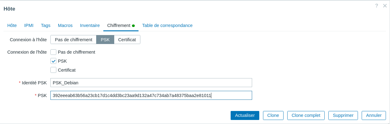 Comme nous avons choisi de chiffrer les communications entre l’agent et le serveur, il est indispensable de paramétrer ce chiffrement au moment de la création de l’hôte. Nous choisirons dans le cas présent un chiffrement PSK, puis définirons correctement l’identité de la clé ainsi que son contenu (à l’identique du fichier PSK créé sur l’hôte monitoré).