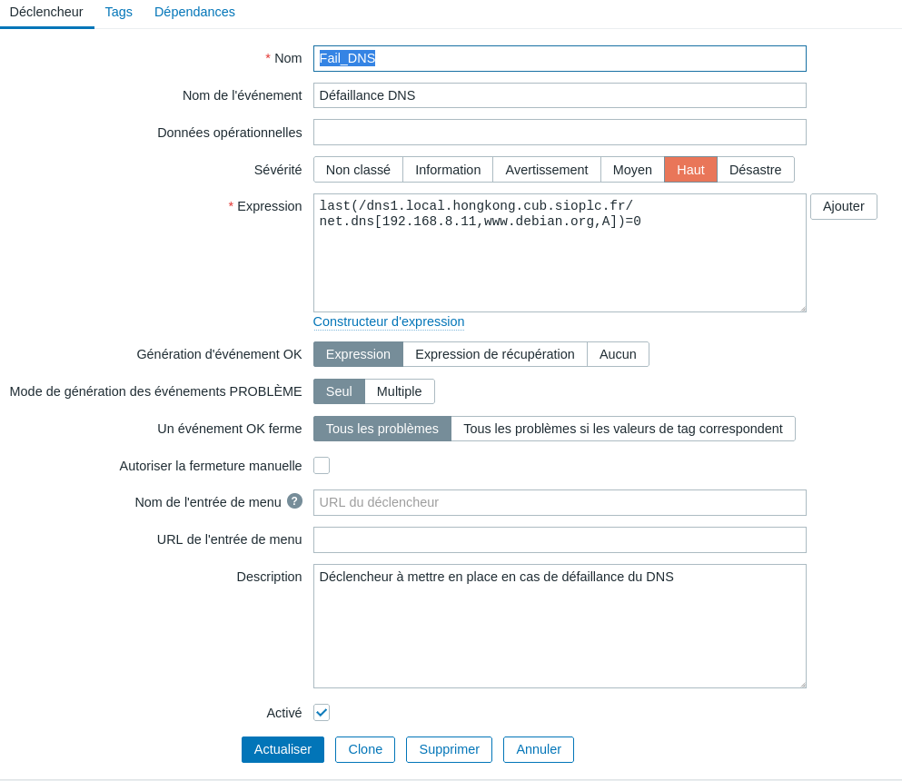 Pour superviser un service réseau après avoir ajouté au préalable un hôte monitoré via l’agent Zabbix. Il est nécessaire de créer un nouvel élément de type « Agent Zabbix » puis de sélectionner une clé correspondant à notre besoin. Une fois, l’élément correctement défini et une valeur récupérée, nous devons créer un déclencheur afin de générer une alerte en cas d’interruption du service réseau en question.