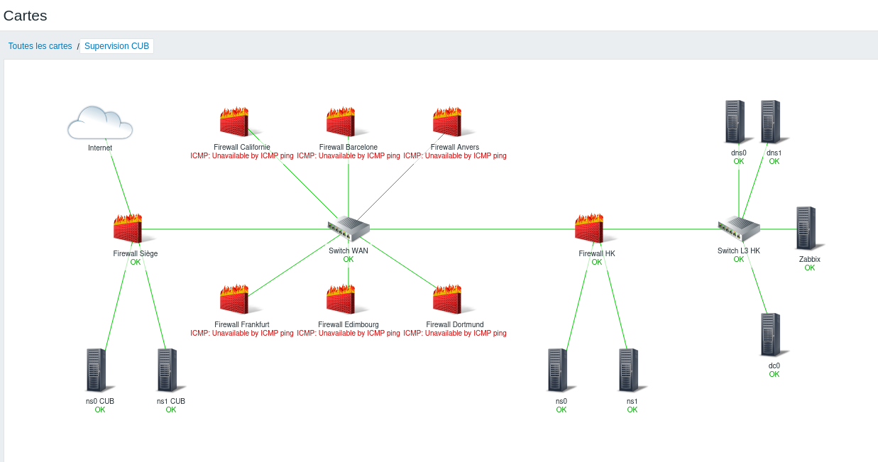 Sur Zabbix, vous avez la possibilité de créer une carte permettant d’avoir une représentation graphique de votre réseau avec les remontées d’alerte présente dessus. Pour créer une carte, il suffit de se rendre dans le menu Surveillance > Cartes.