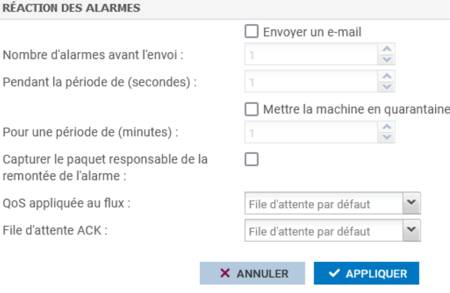 Depuis le menu de configuration des alarmes dans le module « Protection applicative », il est possible d'ajouter une réaction supplémentaire sur réalisation d'un évènement. Ainsi, toute machine déclenchant cet évènement est immédiatement placée en quarantaine pour la durée choisie.