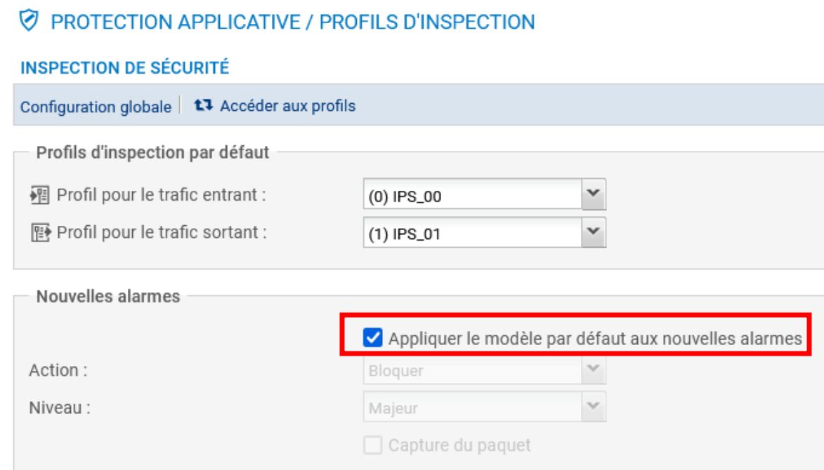 - Se rendre dans le menu Protection applicative, Profils d'inspection, zone nouvelles alarme. L'option Appliquer le modèle par défaut aux nouvelles alarmes est cochée ⇒ celles-ci se mettront à jour automatiquement et seront livrées avec la signature Stormshield Network.
