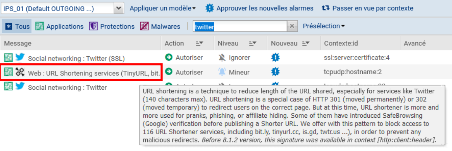 Les signatures contextuelles sont nombreuses et peuvent être mises à jour quotidiennement. Les nouvelles signatures téléchargées (signalées par un drapeau bleu « Nouveau ») sont appliquées automatiquement (sans l'approbation de l'administrateur) aux flux analysés avec l'action et le niveau d'alerte définis par défaut.