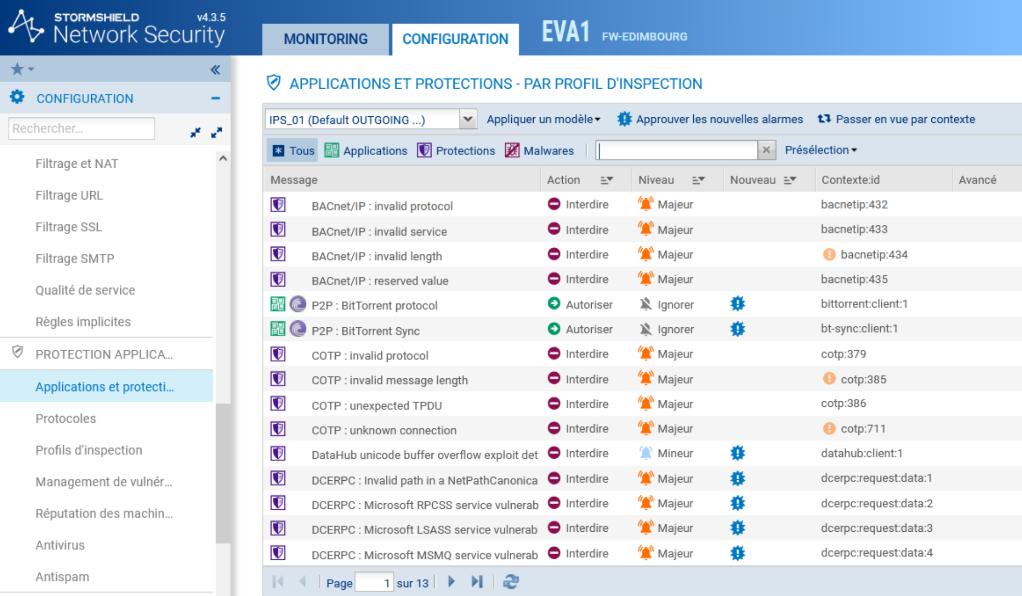 - Les profils sont configurables et administrables depuis les menus Protocoles et Applications et protections sous Configuration ⇒ Protection applicative.