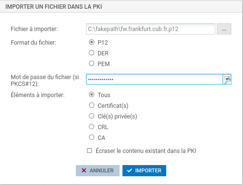 Une fois le fichier p12 téléchargé sur le poste, il est nécessaire de l'importer dans l'autre pare-feu en l'occurence celui de Franckfurt. Pour cela, se connecter sur l'interface d'administration du pare-feu concerné en s'assurant de disposer du fichier p12 sur le poste client d'administration.