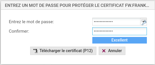Pour cela, clique droit sur le certificat concerné puis Télécharger > Identité > au format P12. Il est demandé d'entrer un mot de passe qui permettra de protéger votre clé privée en particulier en cas de vol ou de compromission.
