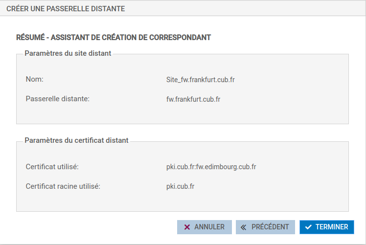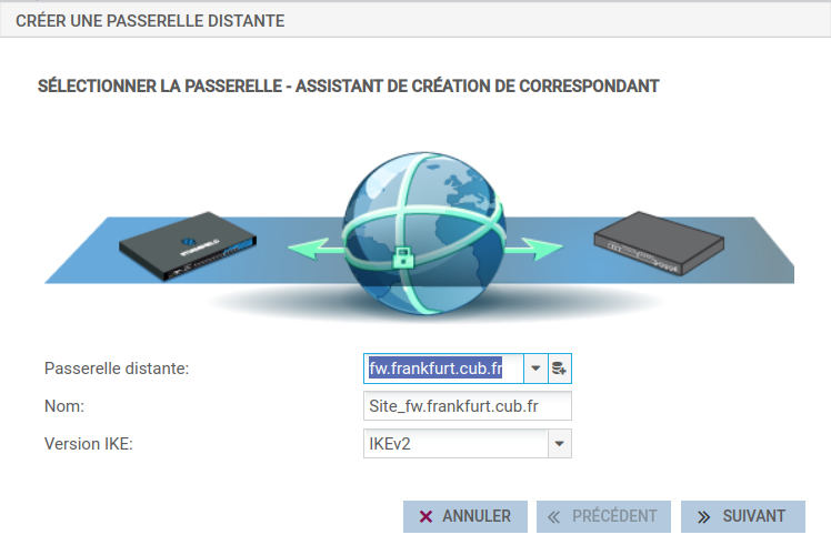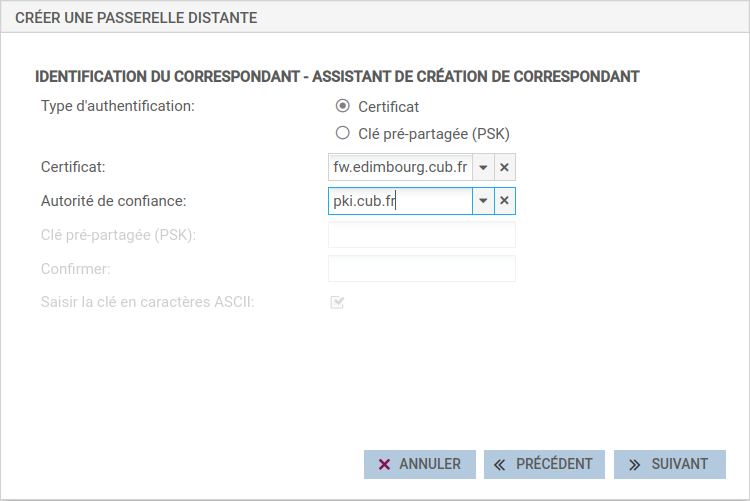 Attention ! Cette étape peut porter à confusion. Bien que le terme « identification du correspondant » soit employé ici, c'est bien le certificat du pare-feu sur lequel vous êtes connecté (ici pare-feu Edimbourg) qu'il faut indiquer et non celui du pare-feu distant.
