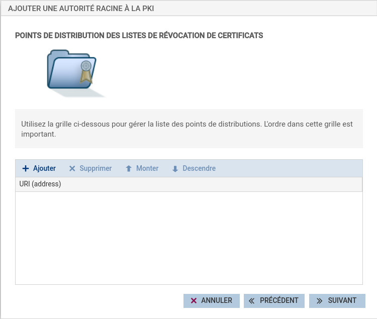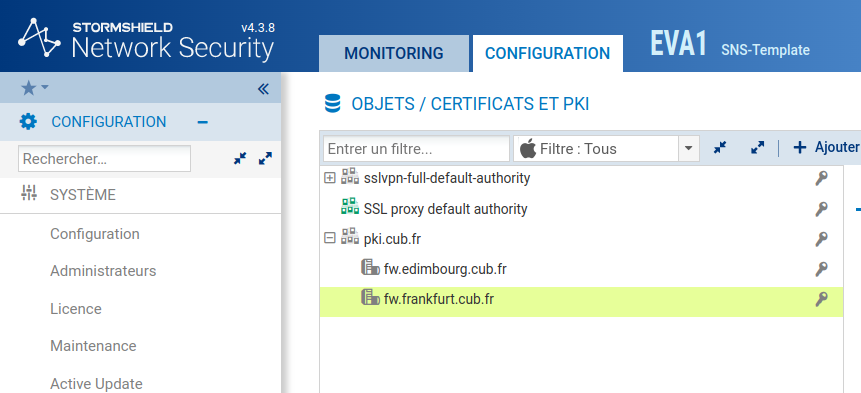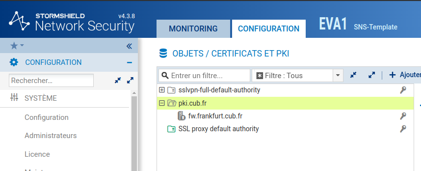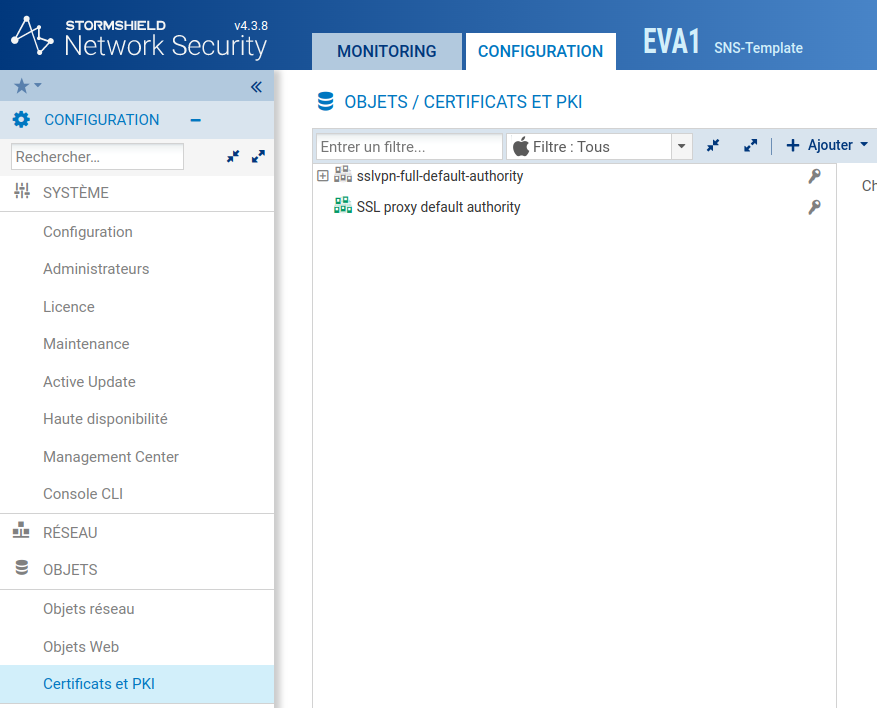 Cliquer sur Configuration > Objets > Certificats et PKI