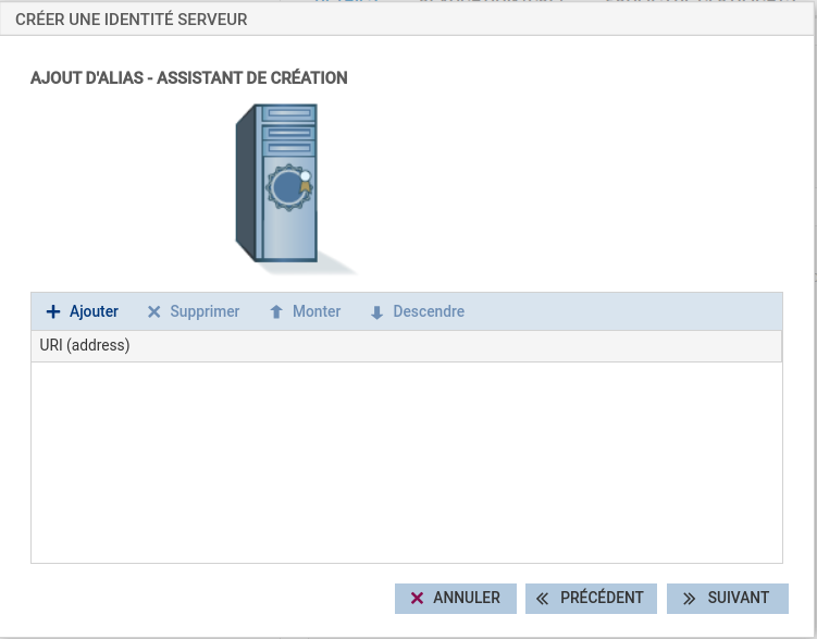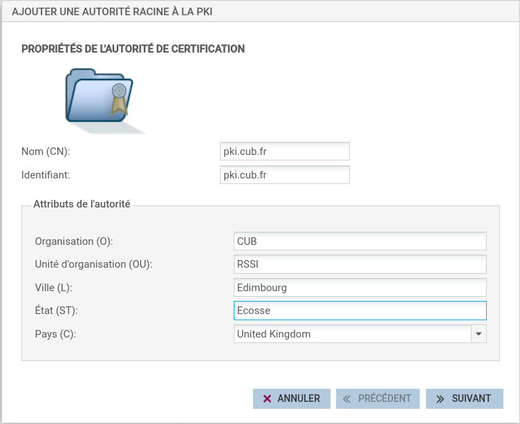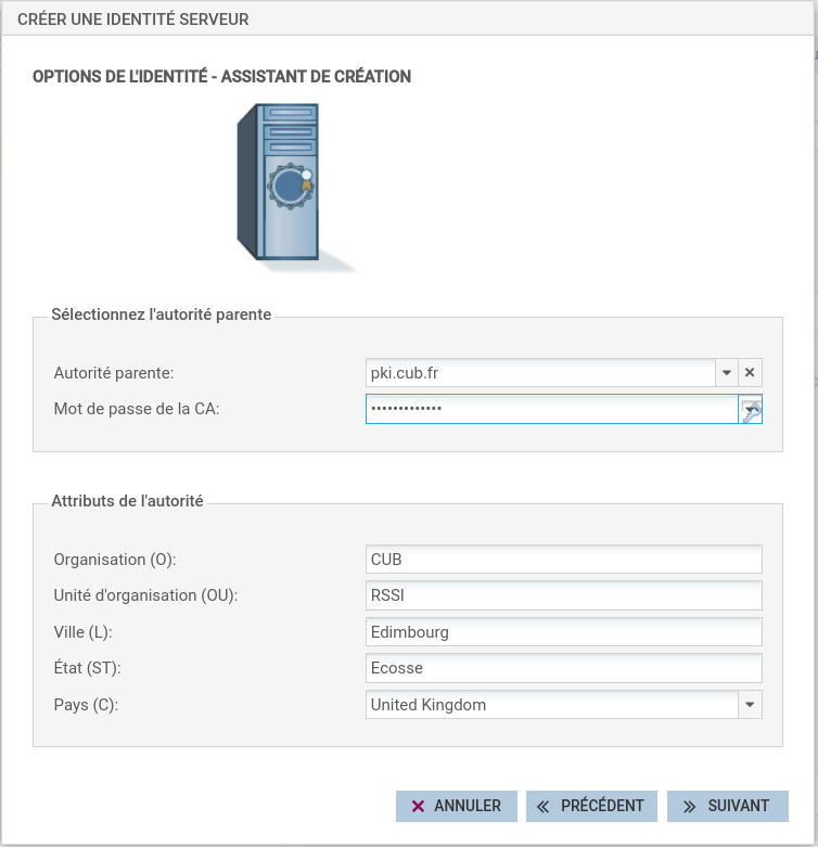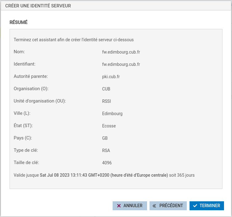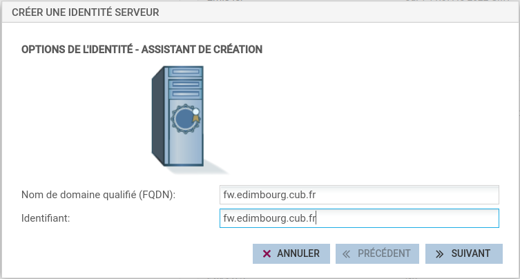 Une fois la nouvelle PKI créée, il est nécessaire de générer 2 certificats pour les 2 pare-feux concernés. Pour cela, sélectionner la PKI pki.cub.fr et cliquer sur Ajouter > Identité serveur afin de créer un certificat pour le pare-feu d'Edimbourg.