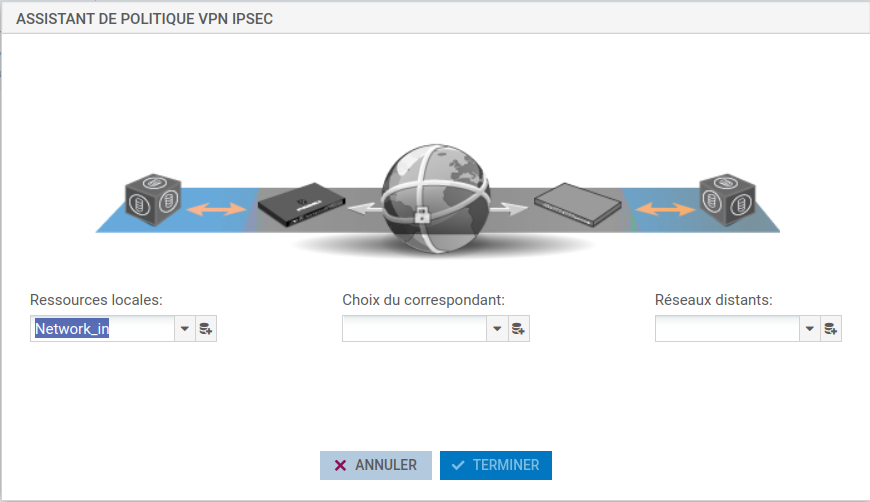 Un assistant s'ouvre et permet de définir quel sous-réseau ou VLAN de votre agence (ici Edimbourg) pourra envoyer et recevoir des flux par le tunnel VPN IPSec jusqu'à l'autre agence (ici Frankfurt). Ainsi, en ressources locales, indiquer le sous-réseau ou le VLAN présent dans votre agence (si vous souhaitez permettre la communication de plusieurs sous-réseaux, il faut au préalable créer un objet groupe contenant l'ensemble des sous-réseaux concernés).