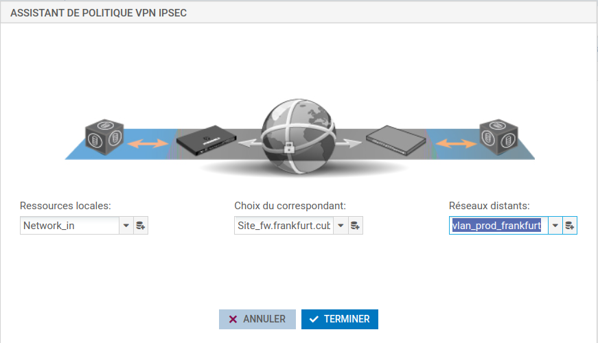 À partir de là, il s'agira de réaliser exactement les mêmes opérations dans le sens inverse sur le pare-feu de l'autre agence (ici Frankfurt) afin de rendre le tunnel pleinement opérationnel.