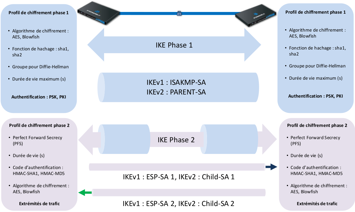 Phase 2 : Les deux extrémités vont négocier le profil de chiffrement de la phase 2 et les extrémités de trafic qui permettront la communication à travers le tunnel. Deux canaux sont ouverts pour le transmission des données, un pour chaque direction. Chaque canal utilise sa propre clé de chiffrement appelée CHILD-SA1 et CHILD-SA2. Chaque extrémité possédera donc deux clés symétriques, une pour chiffrer les données à envoyer et l'autre pour déchiffrer les données reçues dans l'autre canal.