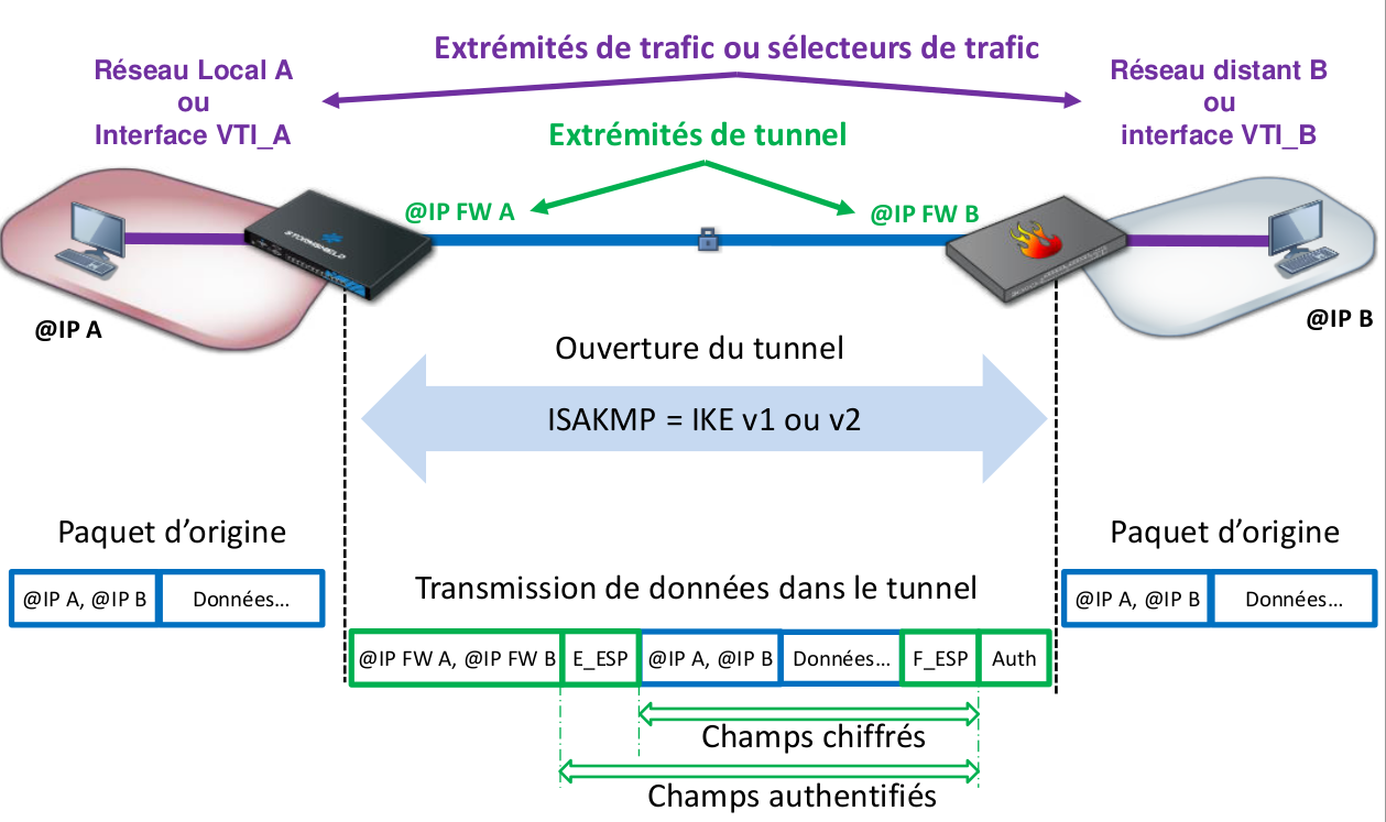 Lorsque vous montez un tunnel IPSec entre deux équipements Stormshield, ces équipements vont chiffrer les paquets et les encapsuler dans le protocole ESP (Encapsulating Security Payload), qui est un protocole de la suite IPSec.