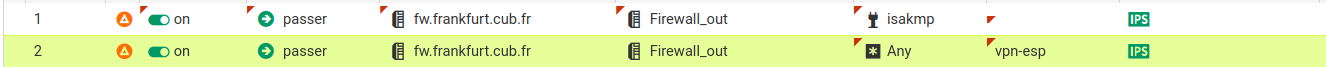Toujours sur le pare-feu de l'agence d'Edimbourg, il faut autoriser l'établissement du tunnel (protocoles ISAKMP et ESP) entre les deux pare-feux. Normalement, une règle implicite est prévue à cet effet, cependant lors de différentes phases de test, cela s'est avéré peu concluant, ce qui nous amène à proposer des règles explicites à ce sujet.