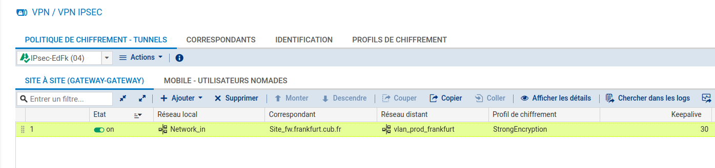 Lorsque la création du tunnel IPSec est effective, il faut bien évidemment l'activer (on) et définir une valeur en seconde de Keepalive (vous veillerez à définir la même valeur sur le pare-feu distant, ici, Frankfurt). Cela permettra de faciliter l'activation du tunnel et assurera le maintien de ce dernier même en cas d'absence de trafic à l'intérieur de celui-ci (lire l'explication ci-dessous).