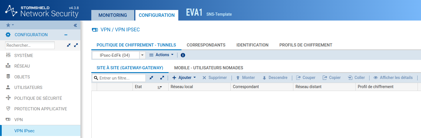 Sur le pare-feu de Edimbourg, cliquer sur Configuration > VPN > VPN IPsec et choisir la politique IPsec 04 (04) qu'il faudra renommer IPsec-EdFk.